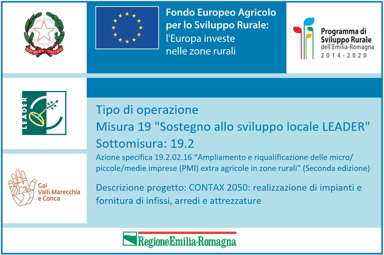 Contributo FEASR: Progetto approvato a valere sul PSR Emilia-Romagna 2014-2020 – Misura 19 . Sostegno allo sviluppo locale Leader. Bando LEADER: GAL Valli Marecchia Conca. Anno di Riferimento 2022. Importo del sostegno totale ricevuto, cofinanziato dall’Unione Europea , spesa ammessa 136.943,72 €, contributo concesso 82.166,23 €.
